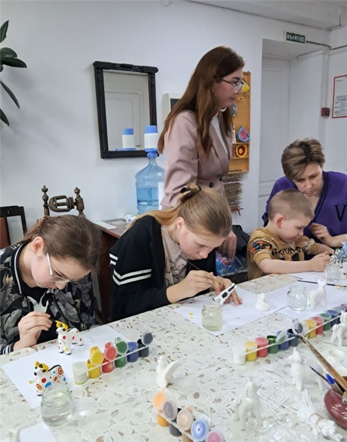 В начале занятия художник отдела прикладного искусства рассказал юным посетителям историю дымковской игрушки. Дети узнали откуда пошло это название, из каких материалов создавались игрушки, как их расписывали. Каждый участник получил гипсовую фигурку лошадки и под чутким руководством мастера-художника приступил к её росписи. И под кистями наших юных посетителей расцветали всеми цветами радуги знаменитые дымковские круги, кольца и точки. Важно отметить, что помощь оказывалась детям ровно в том объёме, который был необходим. Это позволило участникам проявить максимальную самостоятельность и почувствовать уверенность в собственных силах.