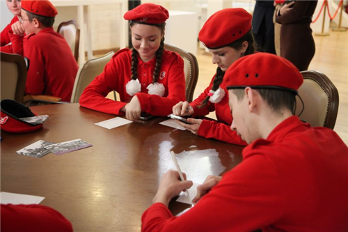 В рамках программы форума юнармейцы прослушали познавательную лекцию об истории города Ростова-на-Дону и на подготовленных музеем открытках написали теплые пожелания для военнослужащих, участвующих в специальной военной операции.